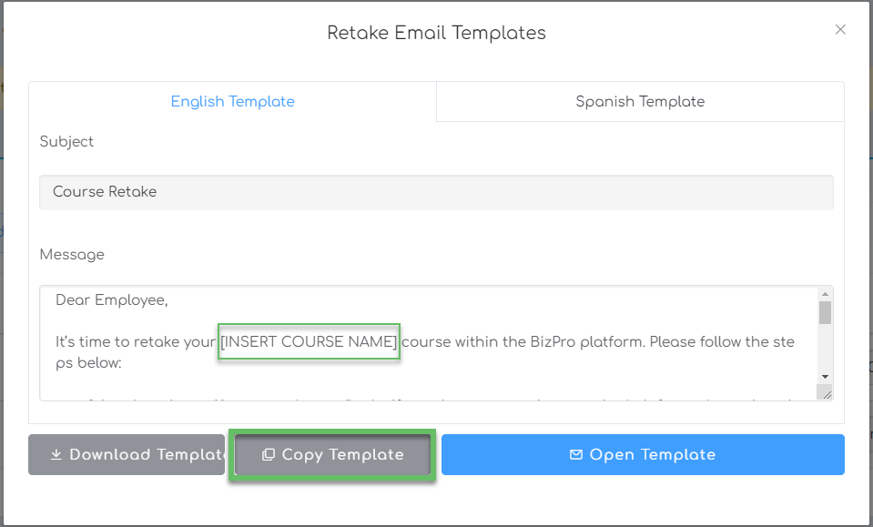 Then select ‘Copy Template’. You can then paste this template into an email and forward it out to your employees. Be sure to insert the appropriate course name before sending.