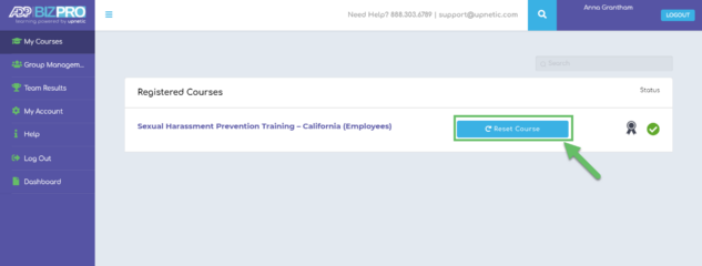 4. IMPORTANT – Once on the My Courses page, employees will need to click on the BLUE “Reset Course” button to the right of the course they need to retake. If the “Reset Course” button is not selected, they will not be able to earn a new certificate.