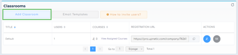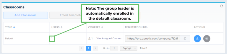 Every group automatically has a “Default” classroom. This classroom name cannot be edited or deleted. If you don’t need to set up multiple classrooms with different courses, or if everyone in your company will be taking the same training course(s) you can simply use the default classroom, rather than adding a new one.