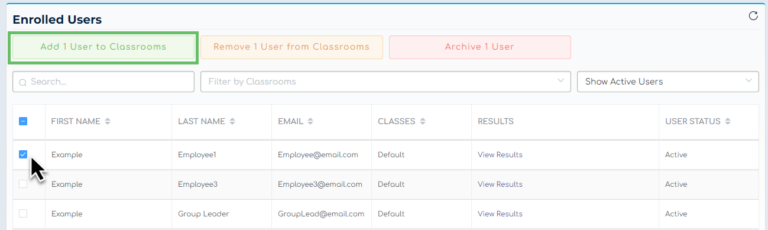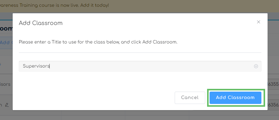 Every account will also have a “Default” classroom that you can use if you do not want or need to group your employees separately; for example, if everyone in the company needs to take the exact same training course, you can use the default classroom.