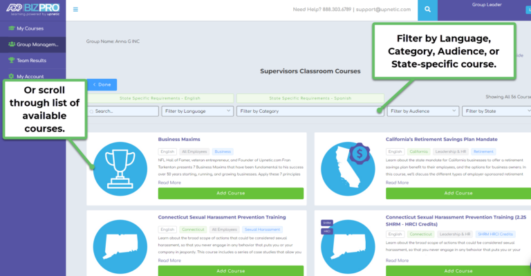 4. After naming your classroom, you will automatically land on the training course catalog page. This page details all of the available courses you can assign to this classroom. You can search for, or filter, courses by title, state-specific courses, language, etc., by using the menu at the top of the page: