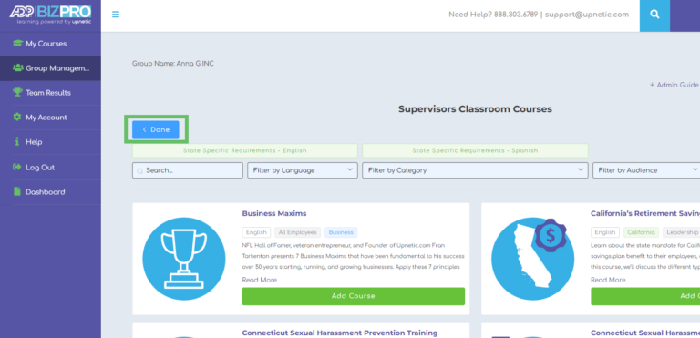 5. Assign courses to your classroom by clicking the “Add Course” button. Once your have selected all of the applicable courses to assign each classroom or group, scroll to the top and select “Done.” After clicking “Done” you will land back on the Group Management page: