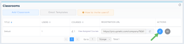 To add a training course to the Default classroom, click on the blue pencil icon under the ‘Actions’ column to be taken to the course library. Alternatively, you can skip the default classroom altogether and move forward in customizing your new classrooms.