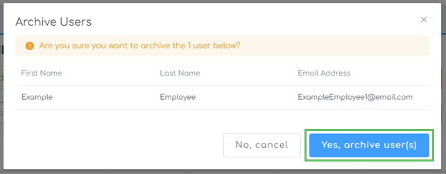 You will receive a prompt to confirm your archive user selection. If you have selected the correct user to archive, confirm your selection by clicking “Yes, archive user(s)”.