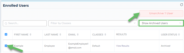 To reactivate an archived employee’s account, begin on the Group Management page, and scroll to the section titled “Enrolled Users”. Filter the employee field by selecting “Show Archived Users” to quickly find the account you would like to reactivate. Select the employee account by clicking on the box to the left of their name then select “Unarchive 1 User”.