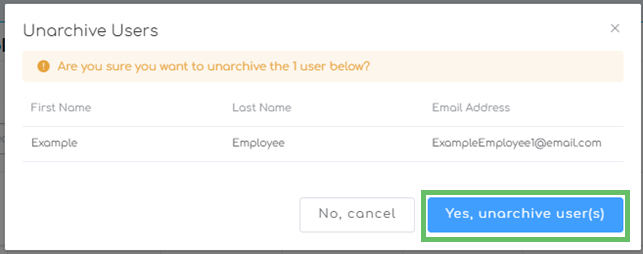 You will receive a prompt to confirm your unarchive user selection. If you have selected the correct user to unarchive, confirm your selection by clicking “Yes, unarchive user(s)”
